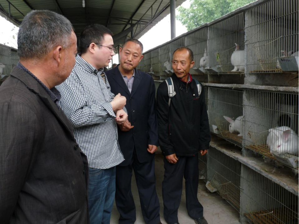 在观胜镇兔场做交流,左二为周勤飞