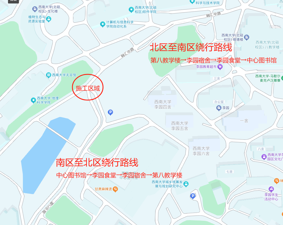 施工期间,请从第八教学楼⇆李园宿舍⇆李园食堂⇆中心图书馆绕行。请提前规划好路线,注意出行安全。