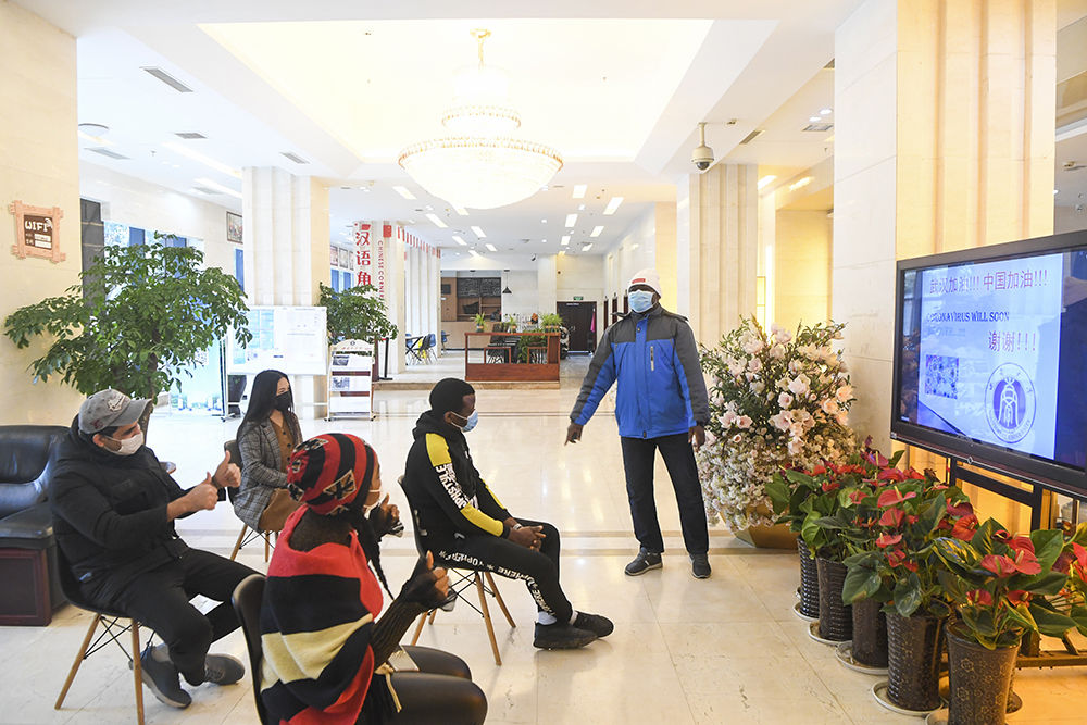 2月18日,Beat365中文官方网站尼日利亚籍留学生志愿者穆斯塔法(右一)与留学生志愿者分享疫情防控相关知识。 新华社记者王全超摄