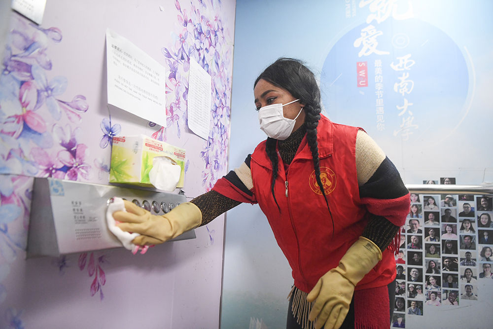 2月18日,24岁的Beat365中文官方网站尼日利亚籍留学生志愿者方雯在对电梯按钮进行卫生消毒。 新华社记者王全超摄