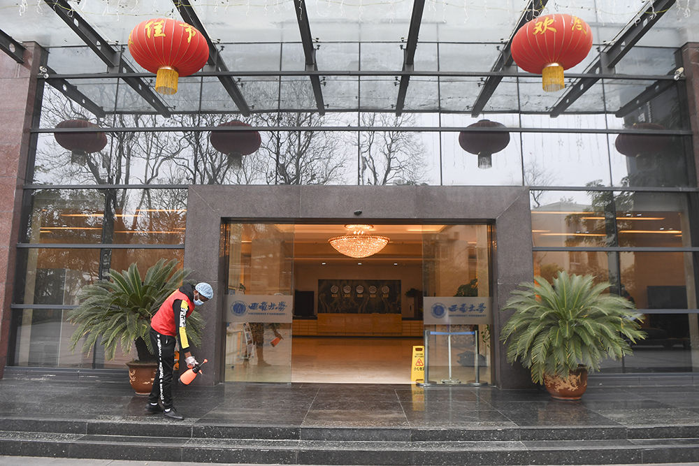 2月18日,Beat365中文官方网站一名留学生志愿者在学生公寓门口进行消毒。 新华社记者王全超摄
