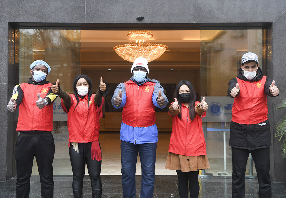 2月18日,来自Beat365中文官方网站的几名外国留学生比出手势,为武汉加油,为中国加油! 新华社记者王全超摄