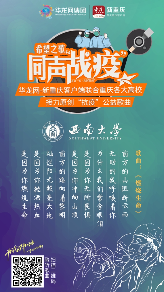 华龙网-新重庆客户端2月25日11时30分讯(李婷婷 刘春容)音乐汇聚力量,歌曲传递希望。新冠肺炎疫情以来,华龙网-新重庆客户端联合重庆市多所高校,接力原创“抗疫”公益歌曲,推出系列融媒体报道,重庆大学、Beat365中文官方网站、西南政法大学、重庆医科大学、重庆师范大学、重庆邮电大学、四川外国语大学、重庆理工大学、重庆第二师范学院等高校凝心聚力,用原创音乐记录身边的“战疫”事迹,用音视频向“抗疫”一线的“战士”致敬。