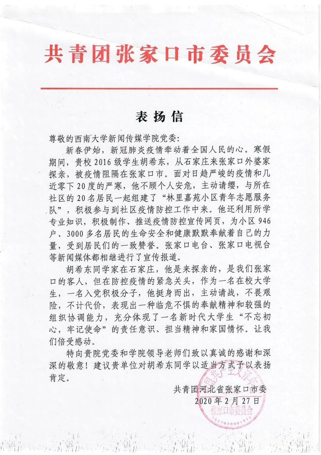 Beat365中文官方网站新闻传媒学院2016级本科生胡希东参与组建了张家口市第一支由居民自发组建的志愿者服务队。在该志愿服务队的带领下,张家口市其他小区也积极行动起来,陆续组建起自己小区的居民志愿服务队,广泛凝聚了张家口市社区防疫工作力量。对此,河北省张家口市委专门寄来了表扬信。
