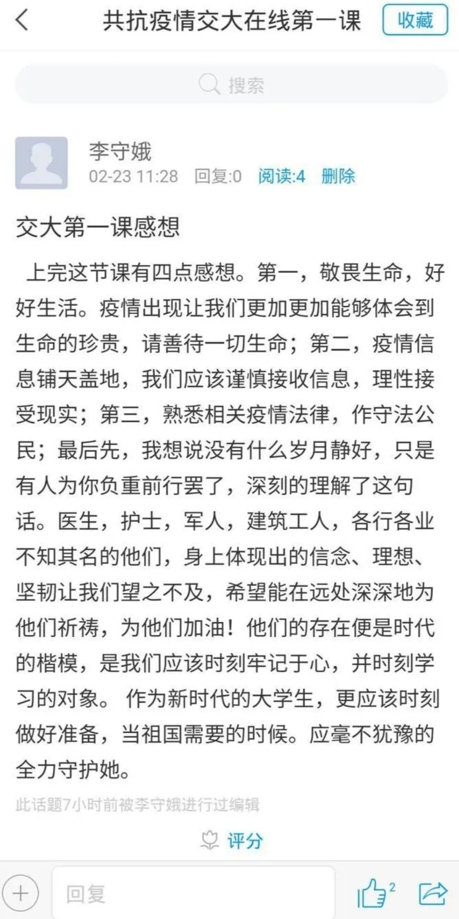 老师们将众志成城抗击疫情的鲜活事例融入思政第一课,引导学生更加坚定在党中央集中统一领导下,打赢疫情防控人民战争、总体战、阻击战的信心和决心,增强中国特色社会主义道路自信、理论自信、制度自信、文化自信。同时运用QQ群、微信群等平台,指导学生进行课程预习和自学,结合当前形势发布讨论话题并加强正面引导,鼓励学生学经典、读原著,实现线上交流有成效,学生学习有收获。