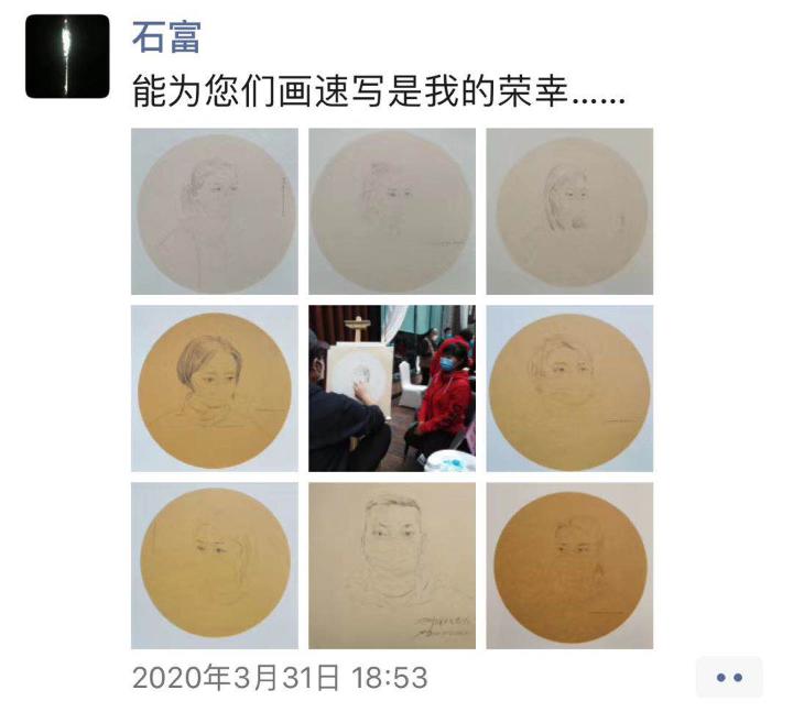 3月下旬,北碚区委宣传部、北碚区文联组织艺术家到重庆心景酒店开展“致敬逆行勇士 情暖白衣天使”活动,石富积极参加。活动中他主要是为援鄂回渝的医疗队成员进行单幅肖像速写创作。由于时间有限,石富需要一面和医疗队员交流,做简单的采访,同时也需要迅速找到光影角度进行现场绘画。