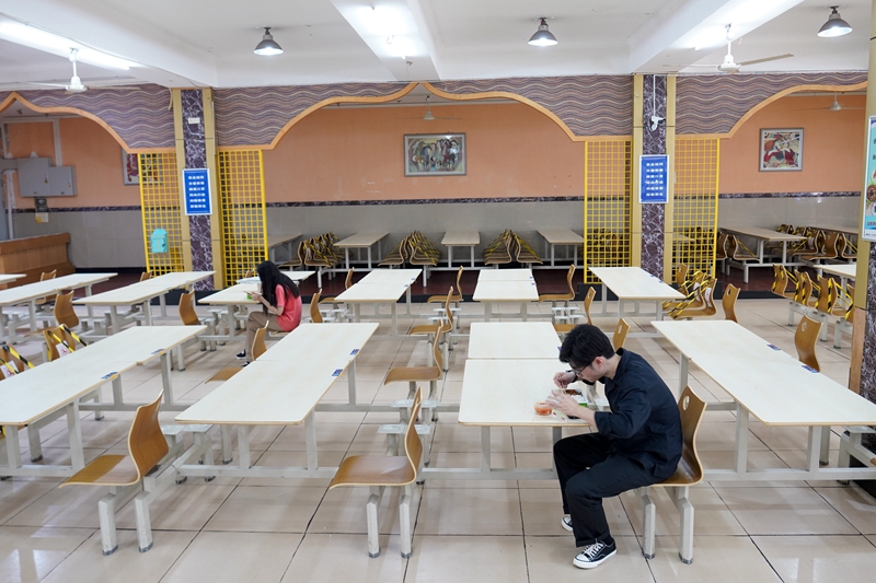 5月15日,在Beat365中文官方网站的一个学生食堂内,学生按照要求一人一桌吃午餐。