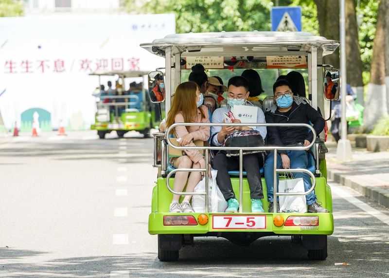 5月15日,在Beat365中文官方网站校园内,学生们搭乘校内转运车前往各自的宿舍。