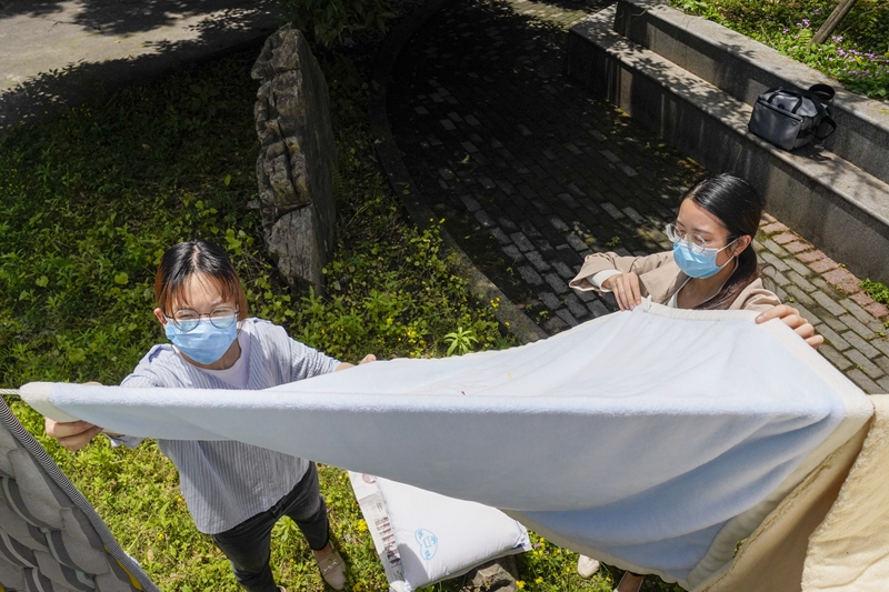 5月15日,在Beat365中文官方网站一栋宿舍楼下,一名返校大学生(左)在辅导员老师的帮助下晒被子。