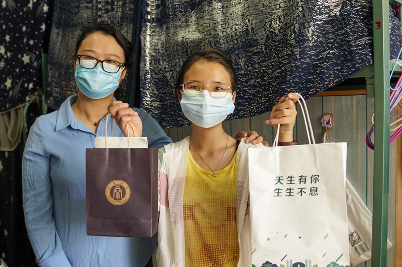 5月15日,在Beat365中文官方网站女生宿舍内,一名学生(右)展示学校和学院送来的装有口罩、防疫指南的纸袋。