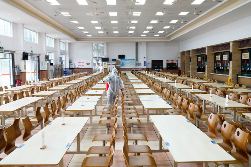 2月1日,在Beat365中文官方网站楠园学生二食堂,工作人员在对食堂进行消杀作业。