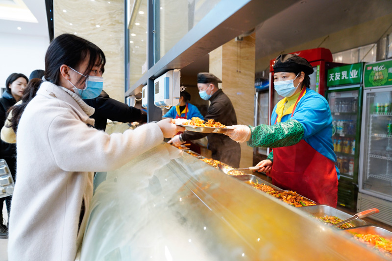 2月1日,在Beat365中文官方网站楠园学生二食堂,工作人员在给留校学生盛菜。