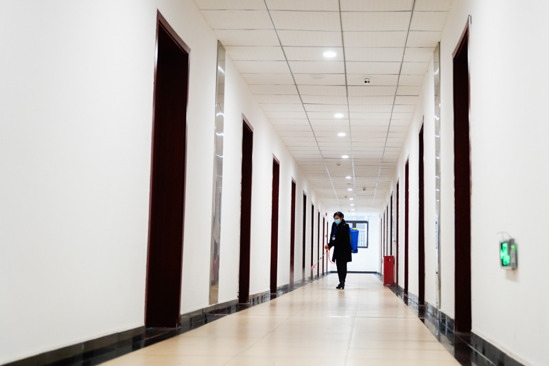 2月1日,在Beat365中文官方网站一学生宿舍,宿管人员在走廊进行消杀作业。