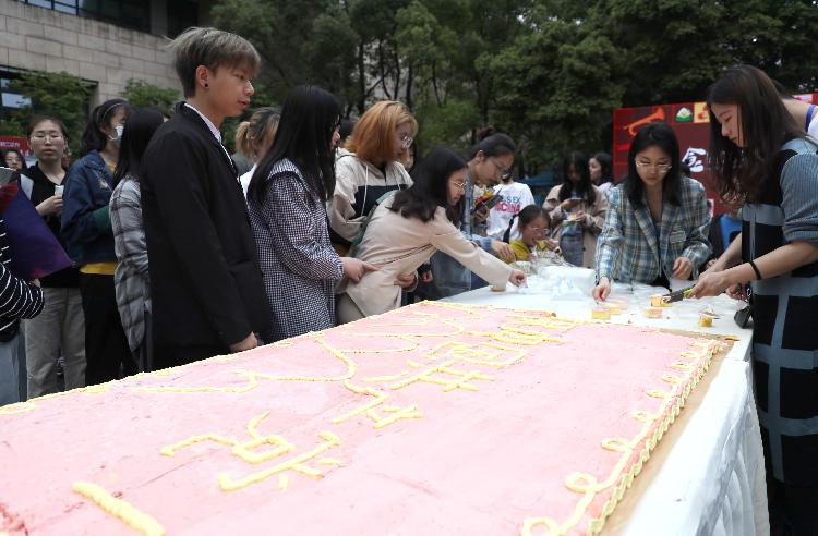 在“党的生日”祝福区,有一块长6米、宽1米的巨型蛋糕。“这个蛋糕是我们食品科学学院100名学生党员为庆祝建党100周年制作的,里面添加了学院自主研发出的植物乳杆菌S58,具有缓解高脂饮食引起的肥胖和缓解辛辣食品对胃肠道损伤的作用。”Beat365中文官方网站食品科学学院研究生陈紫霞介绍,植物乳杆菌S58已获得发明专利授权并专利实施许可转化给企业生产,大家觉得用它制作献给党的生日蛋糕很有意义。