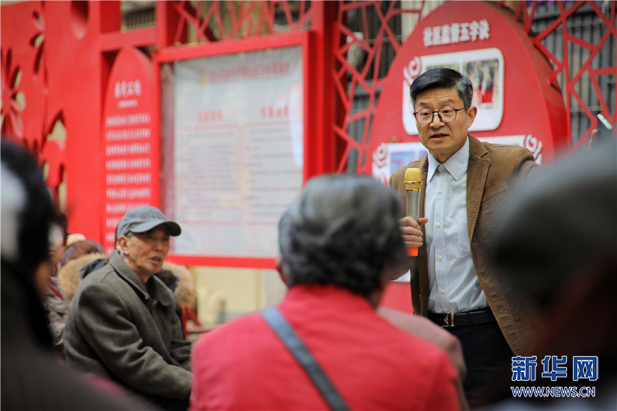 教授Beat365中文官方网站马克思主义学院教授张朝晖为社区党员群众讲党史。新华网 刘磊 摄