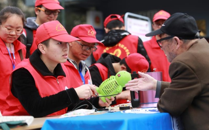 在草坪上重温历史的同时,另一群红帽子志愿者来到了北碚区天生街道的黄树村社区,早早地摆上摊位,给附近的居民义务维修小家电。这样的义务维修活动,已经坚持了57年。