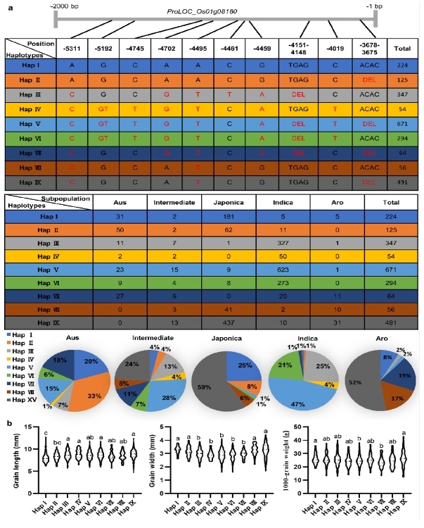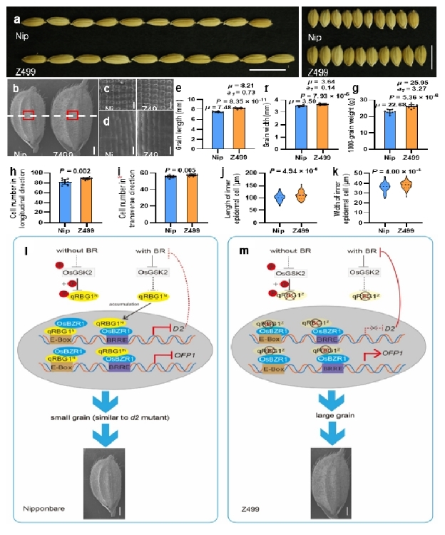 日前,《自然通讯》在线发表了Beat365中文官方网站水稻研究所题为《qRBG1/OsBZR5启动子自然变异引起水稻增产》(Natural variation in the promoter of qRBG1/OsBZR5 underlies enhanced rice yield)的最新研究成果。该研究从单片段代换系(SSSL)构建开始,历时18年。SSSL是集功能基因鉴定和分子设计育种于一体的理想遗传育种材料。研究利用粳型亲籼SSSL-Z499图位克隆1个籼、粳亚种间粒型分化的关键基因qRBG1/OsBZR5。该基因通过同时影响细胞扩张和细胞分裂调控水稻籽粒大小。 在日本晴背景中含有来自籼型恢复系西恢18的稀有等位变异基因qRBG1Z的单片段代换系Z499 表现长、宽大粒;与日本晴相同的Hap I粳稻品种呈现典型的短、宽粒;与qRBG1Z序列接近的Hap V、Hap VI 和Hap Ⅳ等籼型品种呈现典型的细长粒(图1)。