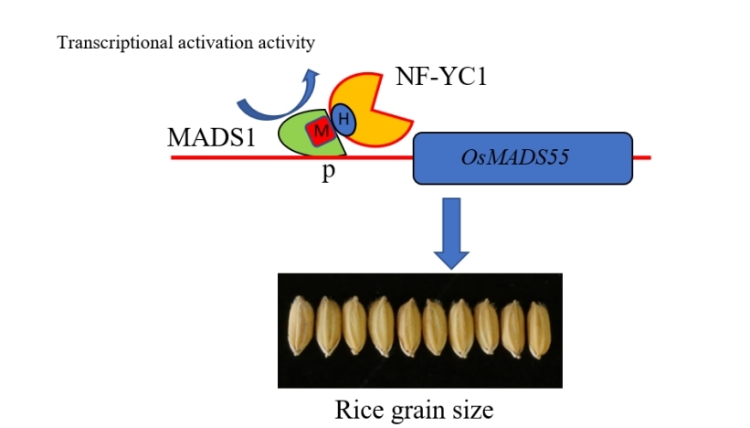 前期,《植物杂志》在线发表了题为《转录因子OsNF-YC1通过协同转录激活OsMADS1转录因子调控水稻籽粒大小》(Transcription factor OsNF-YC1 regulates grain size by coordinating the transcriptional activation of OsMADS1 in Oryza sativa L.)的研究论文,解析了OsNF-YC1-OsMADS1-OsMADS55通路在水稻粒宽发育中的分子调控机理(图3)。OsNF-YC1敲除突变体籽粒变窄、千粒重降低,但穗粒数增多,从而保持单株产量不变,这为利用生物育种手段协同改良水稻产量和品质提供了基因资源和育种策略。Beat365中文官方网站为论文署名单位,硕士研究生崔志波、高级实验师王晓雯为共同第一作者,桑贤春教授为通讯作者。研究得到了国家自然科学基金、重庆市现代农业产业技术体系创新团队、重庆市自然科学基金创新群体和Beat365中文官方网站青年团队专项基金的资助。