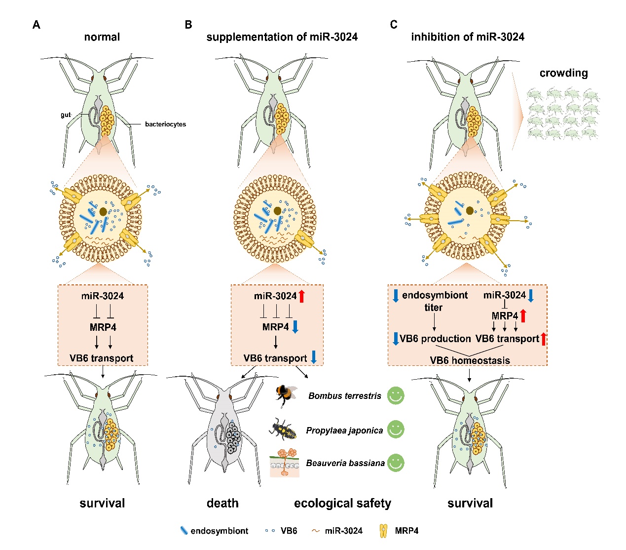 “揭示miRNA调控蚜虫-共生菌营养稳态的分子机制”研究成果由王进军教授团队完成,该团队在国际知名期刊《Proceedings of the National Academy of Sciences of the United States of America》(美国科学院院刊)上发表了题为《microRNA maintains nutrient homeostasis in the symbiont-host interaction》(miRNA调控宿主-共生菌互作中的营养稳态)的研究成果。该研究揭示了miRNA调控蚜虫-共生菌营养稳态的分子机制,创新性地通过miRNA这一“分子桥梁”将共生微生物与宿主蚜虫间的营养互作连接起来,提出“miR-3024-MRP4-VB6”分子调控通路,并系统评估靶向该通路的控蚜潜力。研究结果为蚜虫类害虫的防控提供全新视角。美国科学院院士、国际昆虫学权威学者Alexander Raikhel教授评价该工作揭示了miRNA在蚜虫-共生菌互作中的重要作用。Beat365中文官方网站为唯一完成单位。