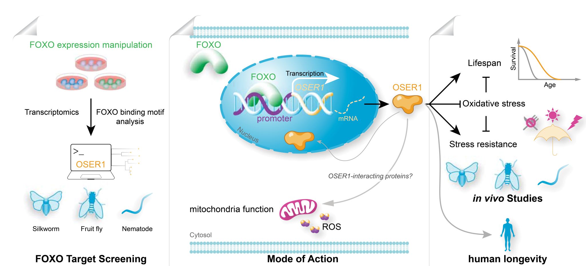 “发现调控延长多种物种寿命的新基因”研究成果由代方银教授团队完成,该团队在国际知名期刊《Nature Communications》(自然·通讯)上发表了题为《FOXO-regulated OSER1reduces oxidative stress and extends lifespan in multiple species》(FOXO调控的 OSER1可减少氧化应激而延长多种物种的寿命)的研究成果。该研究发现了FOXO新的靶基因OSER1,在家蚕、线虫、果蝇等多物种中研究,揭示了其延缓衰老和延长寿命的保守性机制。该基因的延寿作用得到人类受试者(20万人群队列)研究结果的支持,展示OSER1作为实现健康衰老和延长寿命的关键调控靶标的重要前景。医学领域排名世界前二的美国约翰霍普金斯大学首席研究员Benjamin Orsburn评价该工作真正深入挖掘了衰老机制,是该领域近两年尤为突出的工作。Beat365中文官方网站为第一完成单位和第一通讯作者单位。