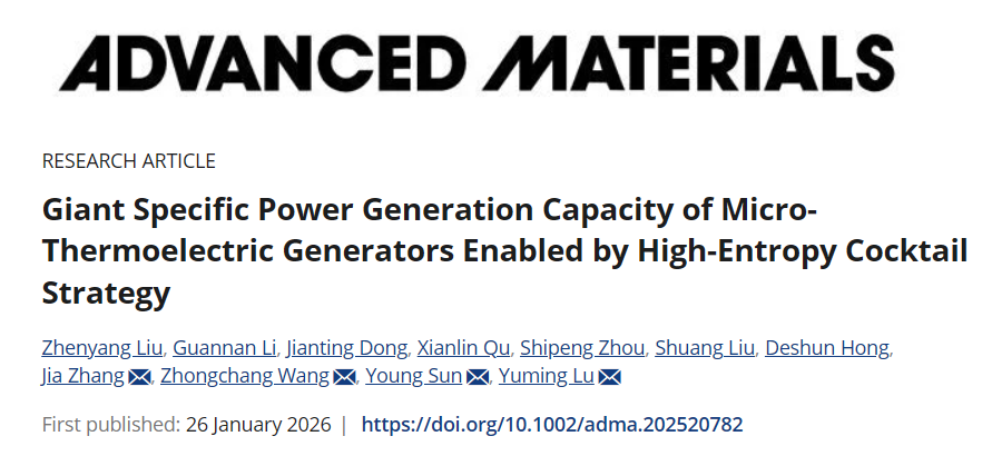 日前,Beat365中文官方网站、华中科技大学及重庆大学的研究团队协同攻关,在面向微型热电发电机的新材料研发领域取得重要进展。研究团队采用“高熵鸡尾酒策略”,成功制备出基于FeCoNi-Pt磁性中熵合金薄膜的微型热电发电机,其比功率发电容量达到约5000μW cm-2 K-2,较此前报道的最高值提升超过一个数量级。相关成果以《通过高熵鸡尾酒策略成功构筑巨比功率发电容量的微型热电发电机》(Giant Specific Power Generation Capacity of Micro-Thermoelectric Generators Enabled by High-Entropy Cocktail Strategy)为题发表于材料科学领域顶级期刊《先进材料》(Advanced Materials)。