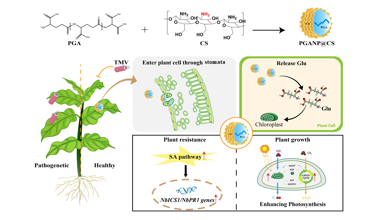 研究发现,天冬酰胺合成酶NbAS-B通过其下游代谢物谷氨酸,同时调控植物光合作用与水杨酸介导的免疫通路,实现生长与抗病性的协同增效。基于此机制,团队进一步开发了负载聚谷氨酸的壳聚糖纳米凝胶(PGANPs),该材料可通过气孔高效进入植物组织,持续释放谷氨酸,兼具抗病毒与促生长双重功能,为作物病毒病绿色防控提供了新型纳米技术方案。
