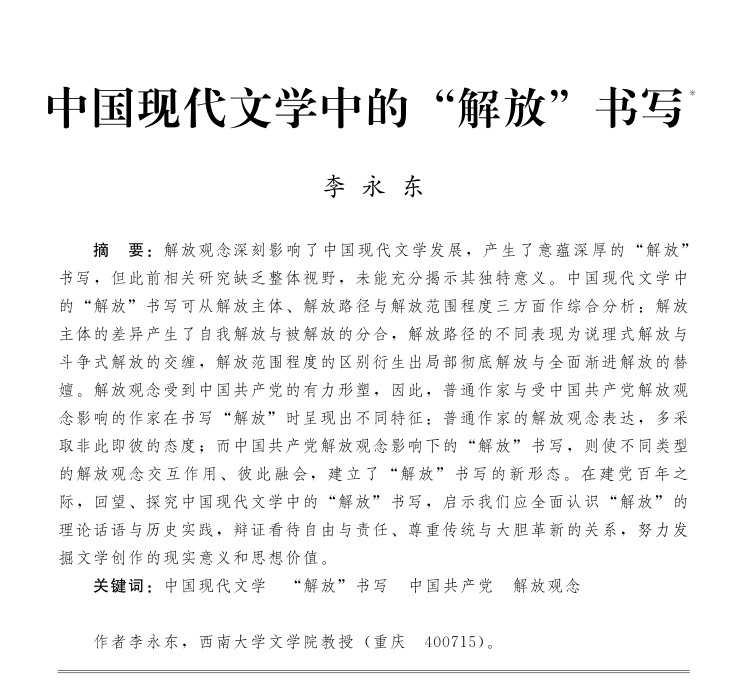 近日,文学院李永东教授撰写的论文《中国现代文学中的“解放”书写》在《中国社会科学》(2021年第7期)发表。