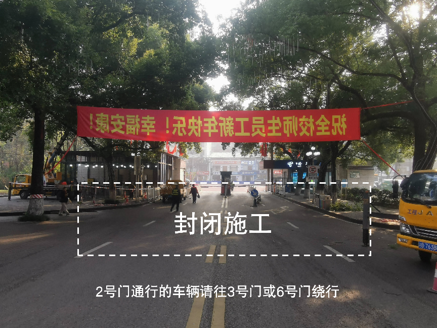 2号门车行道路实施封闭施工,请通行车辆往3号门或6号门方向绕行。
