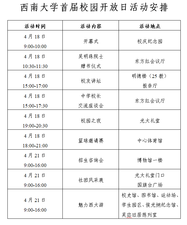 为让广大考生、家长及社会各界人士进一步了解学校良好的育人环境与办学条件、办学特色与师资力量、创新人才培养、大学学习与生活等情况,加强学校与社会的沟通交流,提升社会各界对学校的认知和认同,学校决定于2018年4月18日-21日举办Beat365中文官方网站首届“校园开放日”活动。
