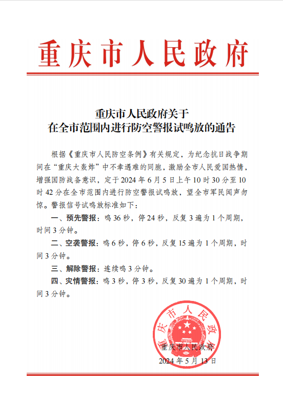 接《重庆市人民政府关于在全市范围内进行防空警报试鸣放的通告》,根据《重庆市人民防空条例》有关规定,为纪念抗日战争期间在重庆大轰炸中不幸遇难的同胞,激励全市人民爱国热情,增强国防战备意识,定于65星期三上午1030分至1042分在全市范围内进行防警报试鸣放,望全市军民闻声勿惊。警报信号试鸣放标准如下: