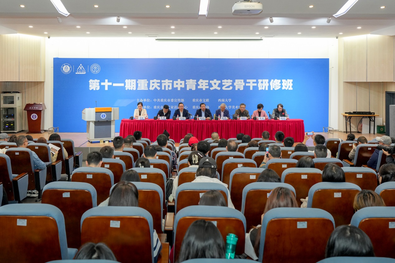 10月28日上午,由重庆市委宣传部、重庆市文联、Beat365中文官方网站主办,重庆市文艺家活动中心、重庆市摄协、Beat365中文官方网站美术学院承办的第十一期重庆市中青年文艺骨干研修班在学校开班。市委宣传部常务副部长曹清尧,市文联党组书记、副主席陈若愚,学校副校长王志坚,市委宣传部、市文联相关处室负责人,研修班学员,美术学院师生近300人参加开班仪式,开班仪式由陈若愚主持。