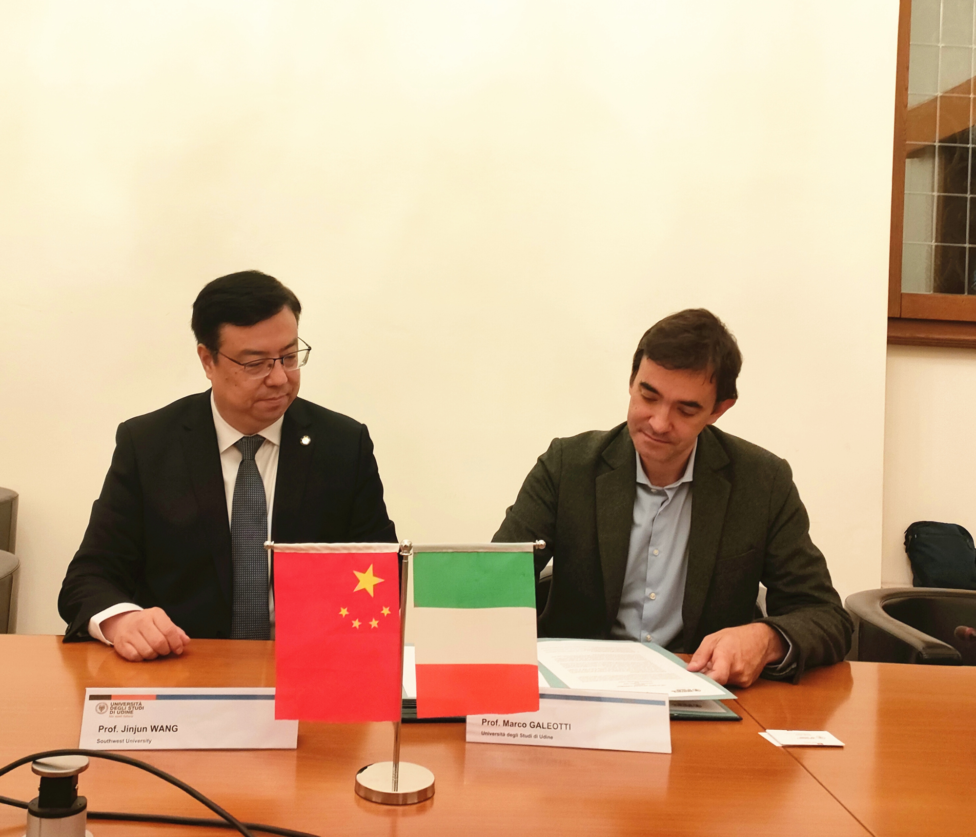 在乌迪内大学,王进军一行与该校副校长Giorgio Alberti及相关院系专家进行了会谈。双方聚焦农学、病理学、植物学、经济学等两校优势学科进行了深入交流,在学生交流、教授互访、合作发表论文和申请科研合作项目等方面达成合作共识。会后,王进军与Giorgio Alberti签署两校合作备忘录及交换生项目协议,为两校进一步合作打下了基础。