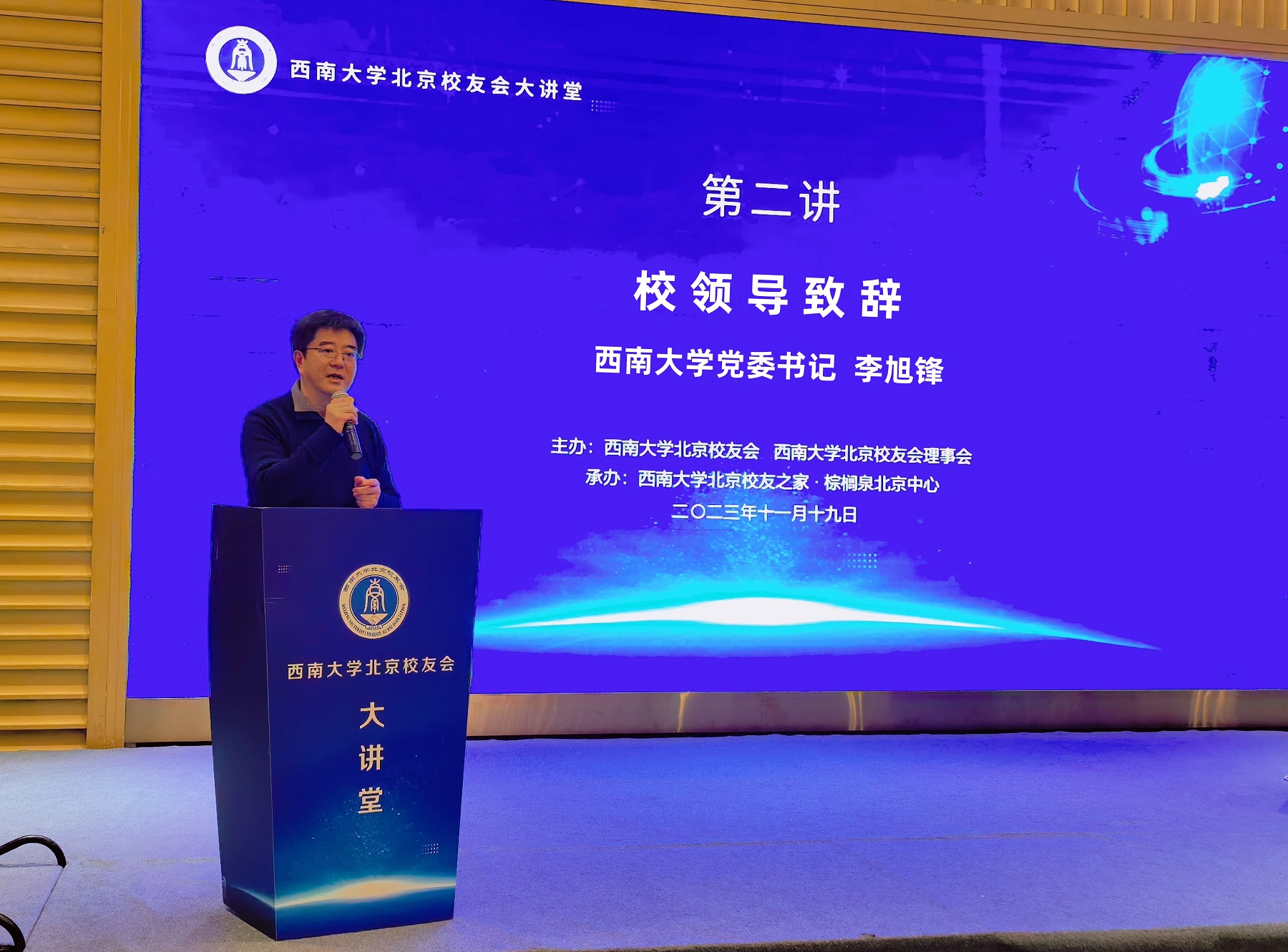 曾伟致欢迎辞,感谢马建堂主任和李旭锋书记一行出席本次活动,对各位校友的到来表示热烈欢迎,并表达了对讲座内容的期待。