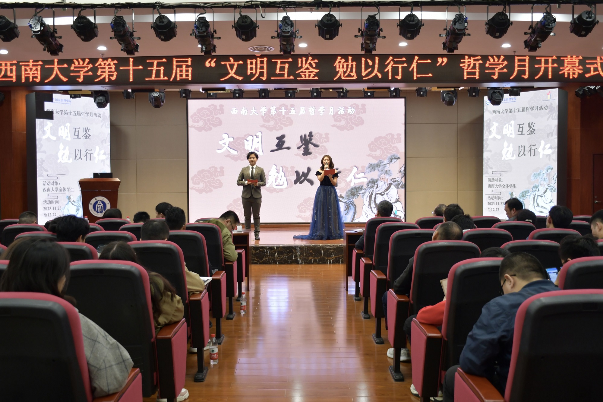 11月23日晚,学校第十五届哲学月开幕式在博物馆4楼报告厅举行。本次大会由国家治理学院、中希文明互鉴中心、社会科学处(社科联)、学生处主办。中山大学哲学系方向红教授,原副校长、中希文明互鉴中心中方主任崔延强教授,国家治理学院院长潘孝富教授,以及学校职能部门负责人,国家治理学院党政领导班子、哲学系教师代表和近200名同学参加开幕式。