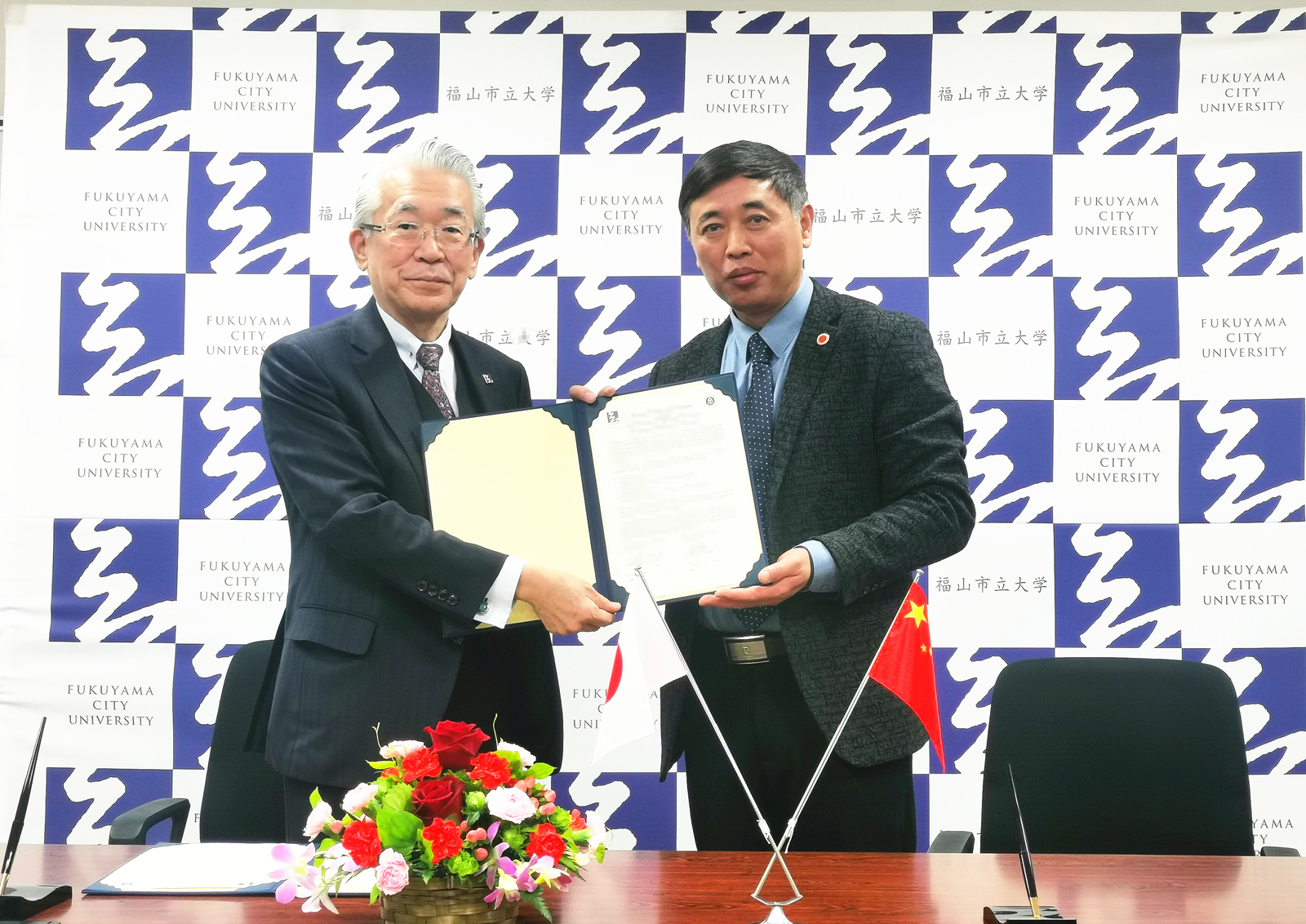 潘洵一行来到日本福山市立大学,与该校理事长、校长佐藤利行,理事、副校长向井厚志,事务局长渡部廉弘等进行会谈,并举行校级合作备忘录签约仪式。佐藤校长对学校代表团到访表示热烈欢迎,回顾了与学校在30年前结缘的经历。