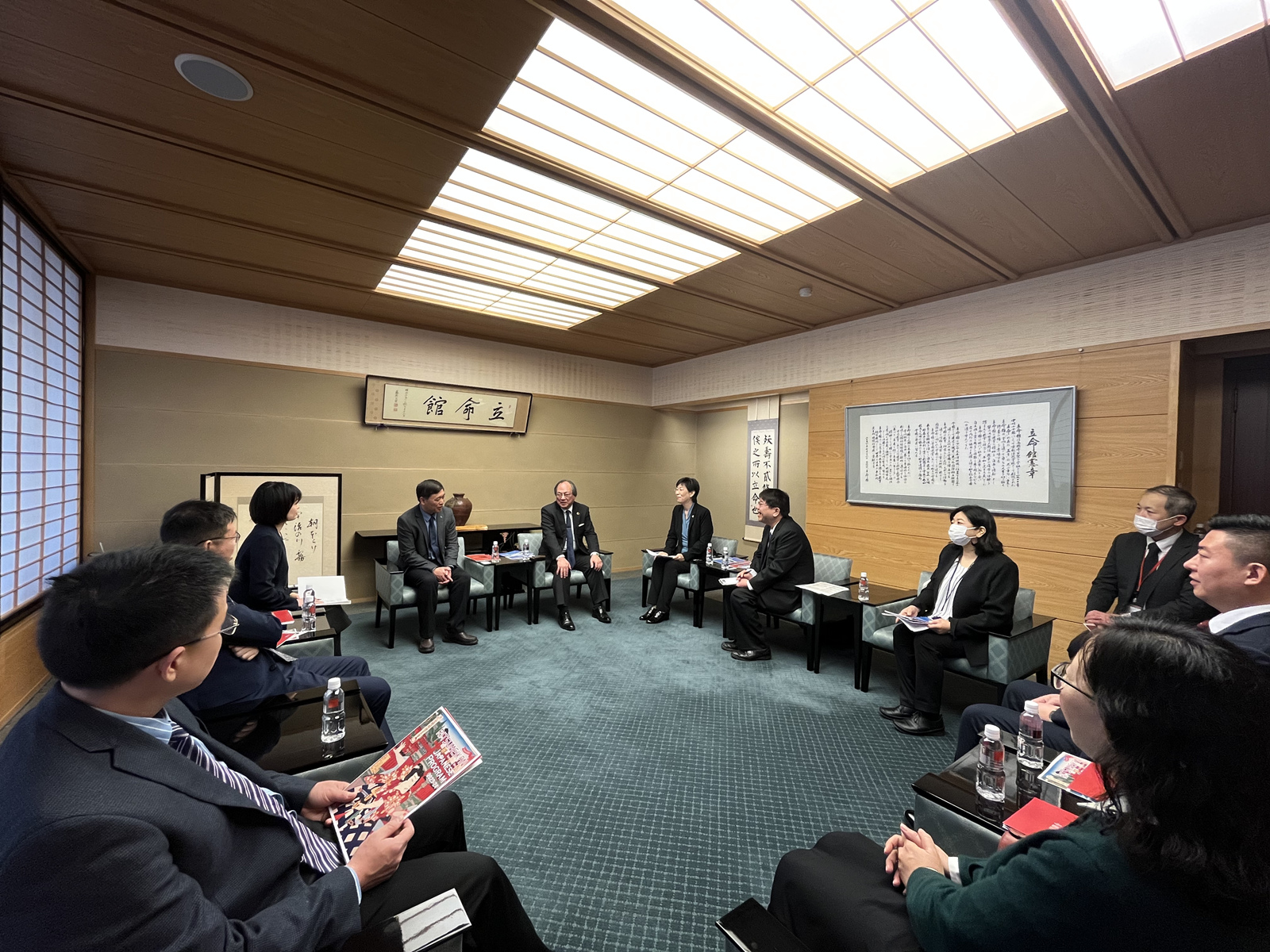 在立命馆大学,代表团会见了校长仲谷善雄一行,就拓展双方合作进行深入会谈。学校与立命馆大学于2006 年建立校际合作,两校交流合作基础深厚,双方在会谈中进一步探讨了学生联合培养、教师学术交流以及推动科研合作等事宜。