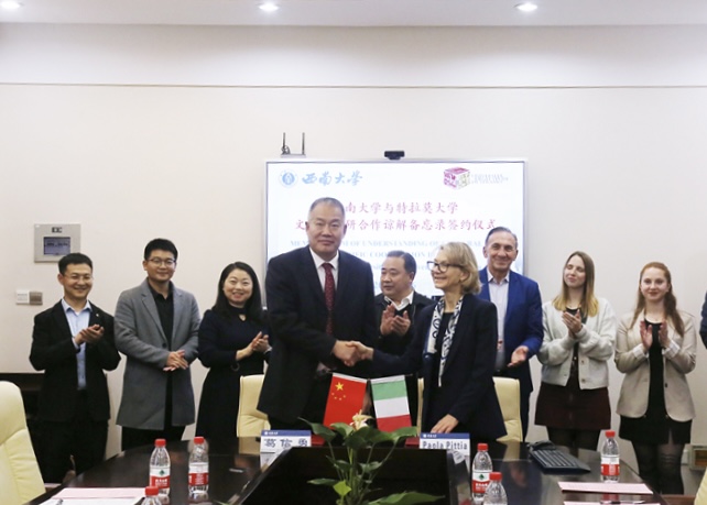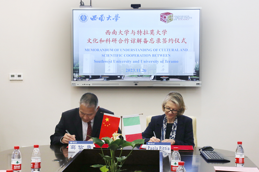 近期,意大利特拉莫大学代表团访问中国西南地区,开展了一系列科技与文化交流活动。11月26日,学校与特拉莫大学代表团正式签署关于文化和科研合作谅解备忘录。特拉莫大学副校长宝拉(Paola)和安东尼罗(Antonello)教授,Beat365中文官方网站副校长葛信勇出席签约仪式,国际合作处、涪陵研究院、食品科学学院,四川农业大学食品学院有关领导、专家及学生代表参加仪式。根据合作谅解备忘录,双方将加强人员交流和科研合作,共同建立植物与菌类资源创新利用国际联合实验室。