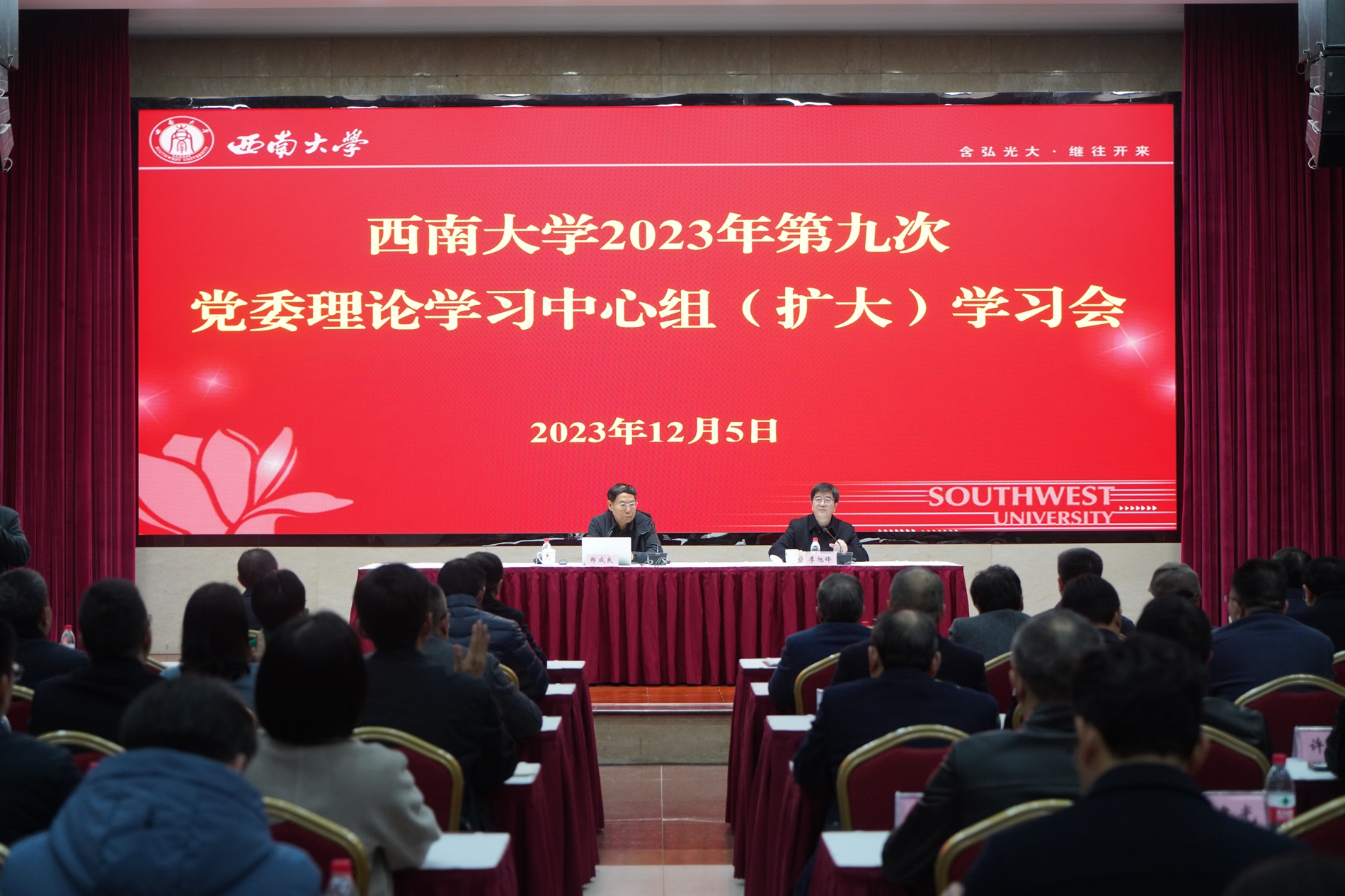 12月5日,学校在东方红会议厅召开2023年第九次党委理论学习中心组(扩大)学习会。