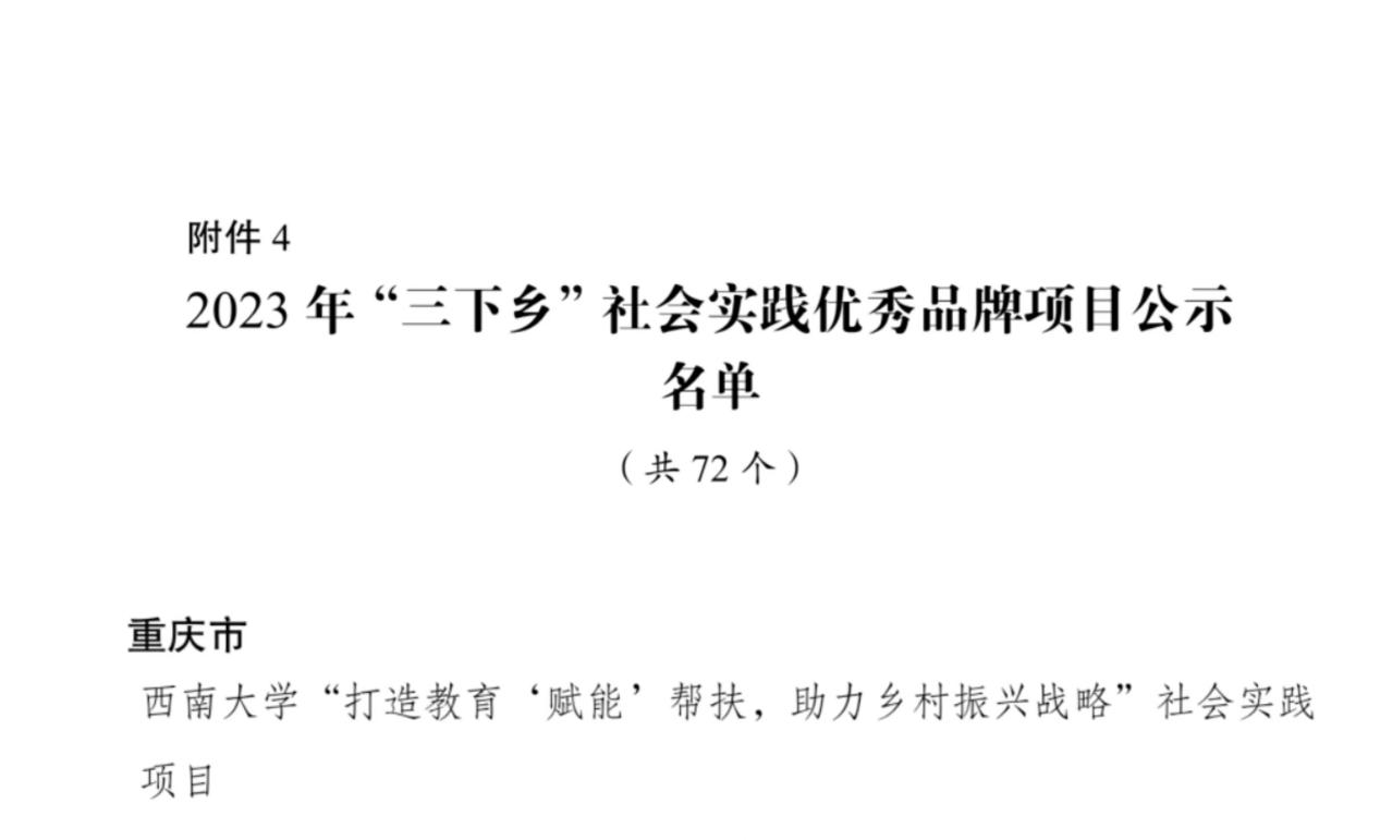 近日,中央宣传部、中央文明办、教育部、共青团中央、全国学联公布了2023年全国大中专学生志愿者暑期文化科技卫生“三下乡”社会实践活动总结通报,经学校申报、团市委审核推荐、团中央组织评议等环节,《Beat365中文官方网站“打造教育‘赋能’帮扶,助力乡村振兴战略”社会实践项目》荣获全国“三下乡”社会实践优秀品牌项目,也是重庆市唯一入选全国的社会实践品牌项目。
