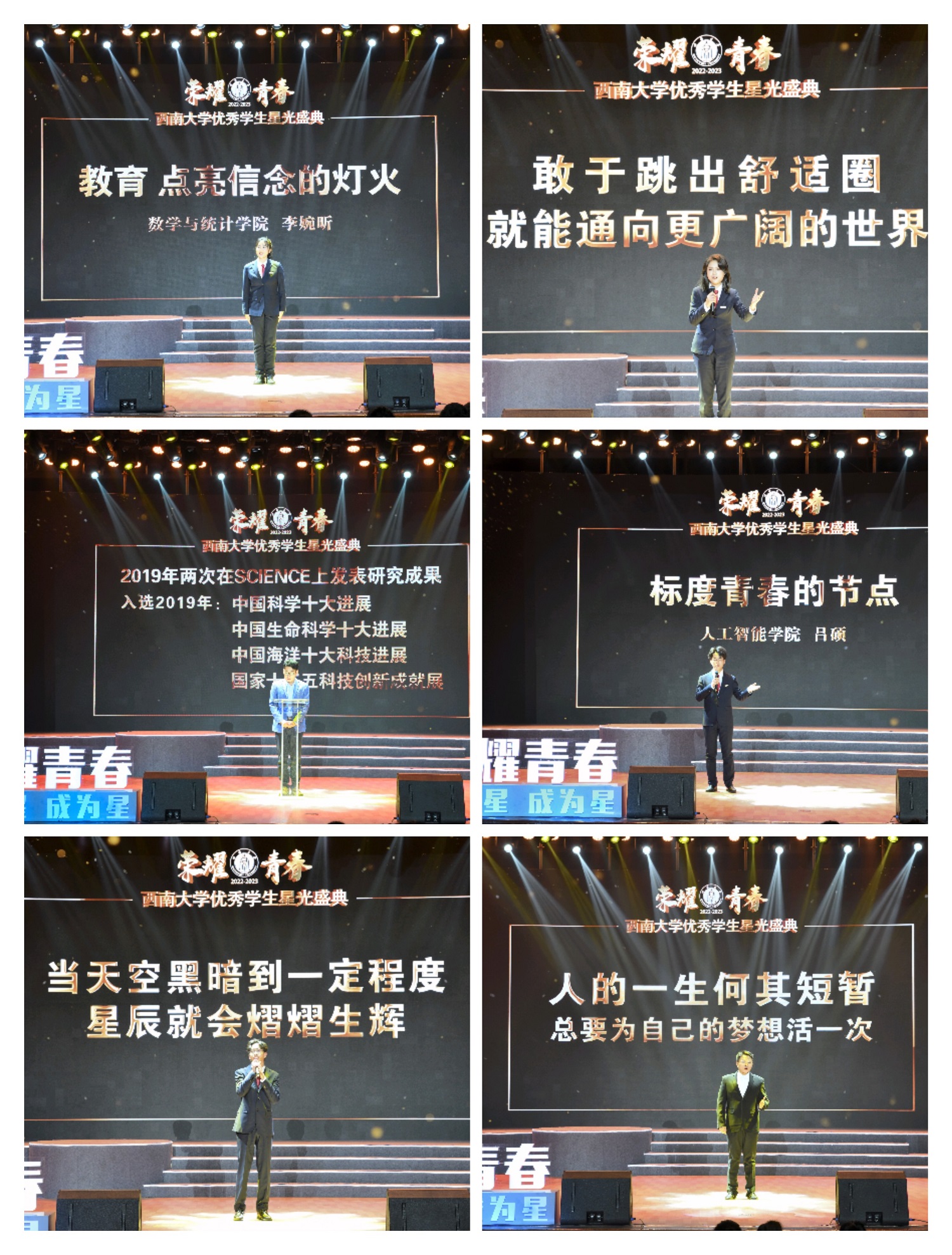 青春因奋斗而出彩,青春因荣耀而闪亮。为激发全校学生学习先进、争当先进、赶超先进的热情,营造优良校风学风,全面彰显“新学工”育人格局,用典礼定格西大好青年的青春群像,12月17日晚,学校“荣耀青春”2022-2023学年优秀学生星光盛典在光大礼堂举行。学校全体在校校领导出席活动并为受表彰学生颁奖。学校学生工作领导小组成员单位负责人,教学单位党政负责人,辅导员、班主任代表,校友代表,学生代表等800余人参加活动。