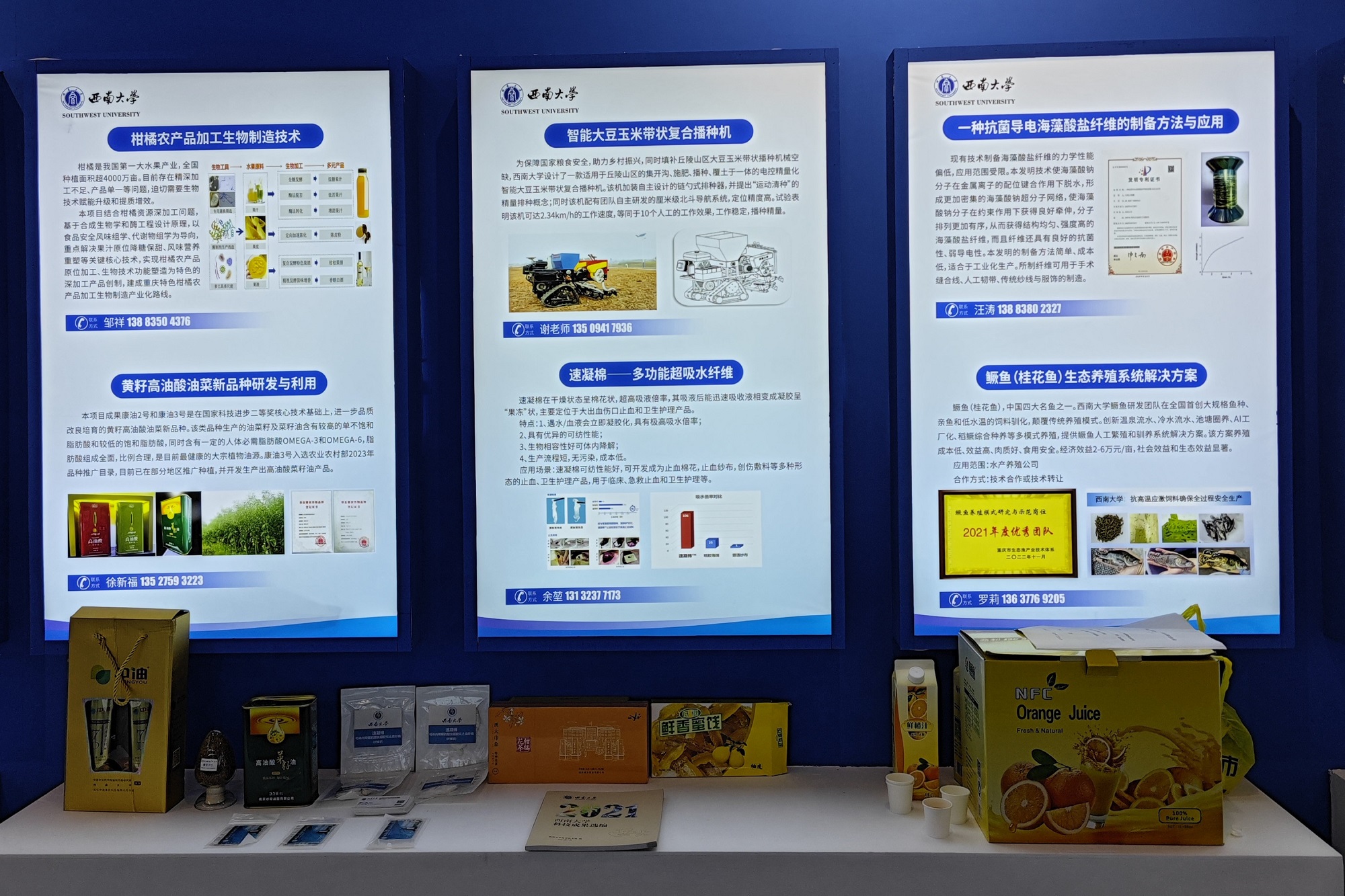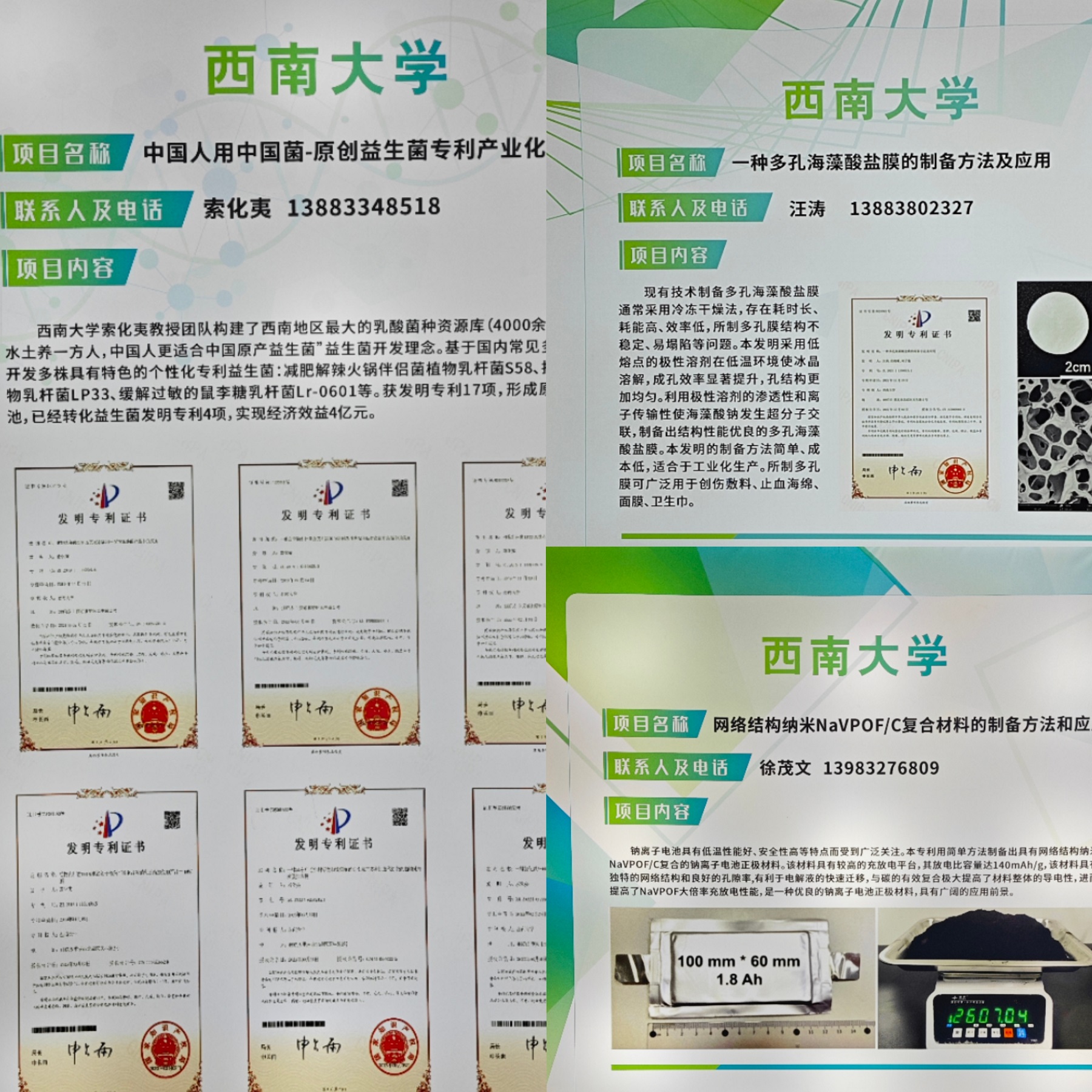 学校科学技术处组织遴选了来自材料与能源学院、工程技术学院、食品科学学院、农学与生物科技学院、柑桔研究所、蚕桑纺织与生物质科学学院、水产学院、药学院 中医药学院的9项科技成果在本次交易会展示,涉及大健康、生物医药、现代农业、新材料、节能与新能源等多个领域。其中“中国人用中国菌——原创益生菌专利产业化”“网络结构纳米NaVPOF/C复合材料的制备方法和应用”“一种多孔海藻酸盐膜的制备方法及应用”3项科技成果在高价值专利成果展区集中展示;“速凝棉——多功能超吸水纤维”“鳜鱼(桂花鱼)生态养殖系统解决方案”“黄籽高油酸油菜新品种研发与利用”“柑橘农产品加工生物制造技术”“一种抗菌导电海藻酸盐纤维的制备方法与应用”“智能大豆玉米带状复合播种机”6项科技成果在高校重大科技成果展区集中展示。“中国人用中国菌——原创益生菌专利产业化”入选生物医药专场路演项目。