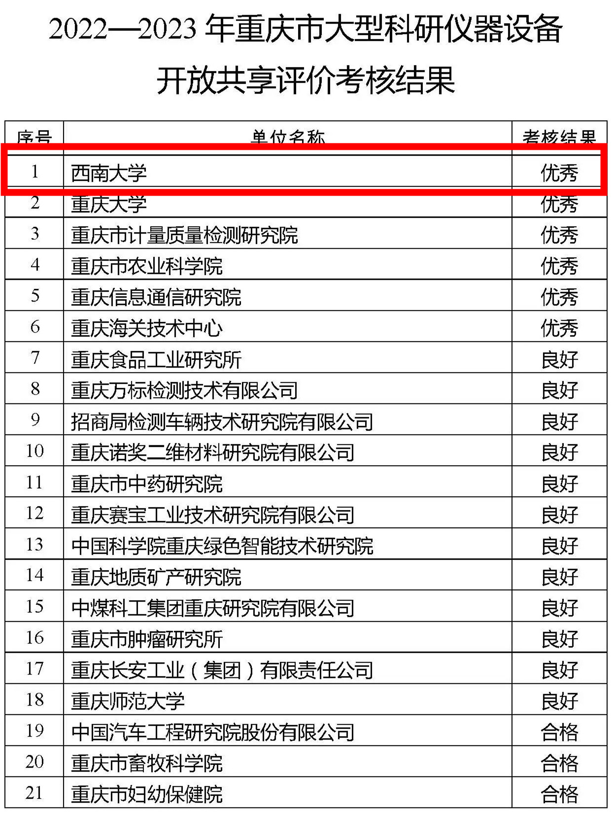 继在2023年11月19日获2023年中央级高校和科研院所等单位重大科研基础设施和大型科研仪器开放共享评价考核“良好”后。学校在2022—2023年重庆市大型科研仪器设备开放共享评价考核中获得“优秀”,在参评的58家单位中排名第一,并获得补助奖励10万元。