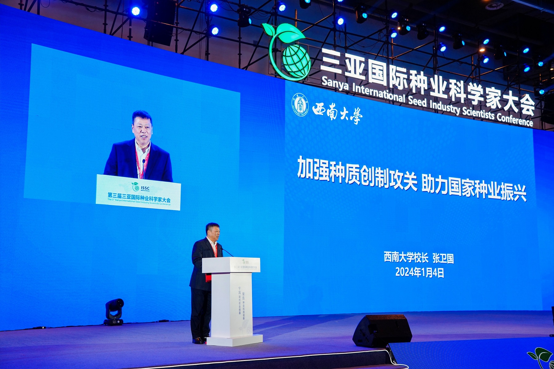 1月4日至6日,第三届三亚国际种业科学家大会暨国际种业科技博览会在海南三亚举行。国际种业科学家联合体副主席、校长张卫国出席会议。副校长、长江上游水产种质资源库团队负责人王志坚,种质创制大科学中心首席科学家、国际种业科学家联合体执委会副主任夏庆友,学校党政办公室、科学技术处、科学中心、涪陵研究院负责人,种创中心相关团队负责人及科研骨干代表参加会议。