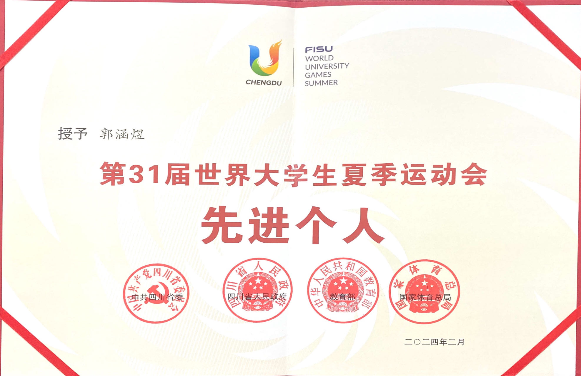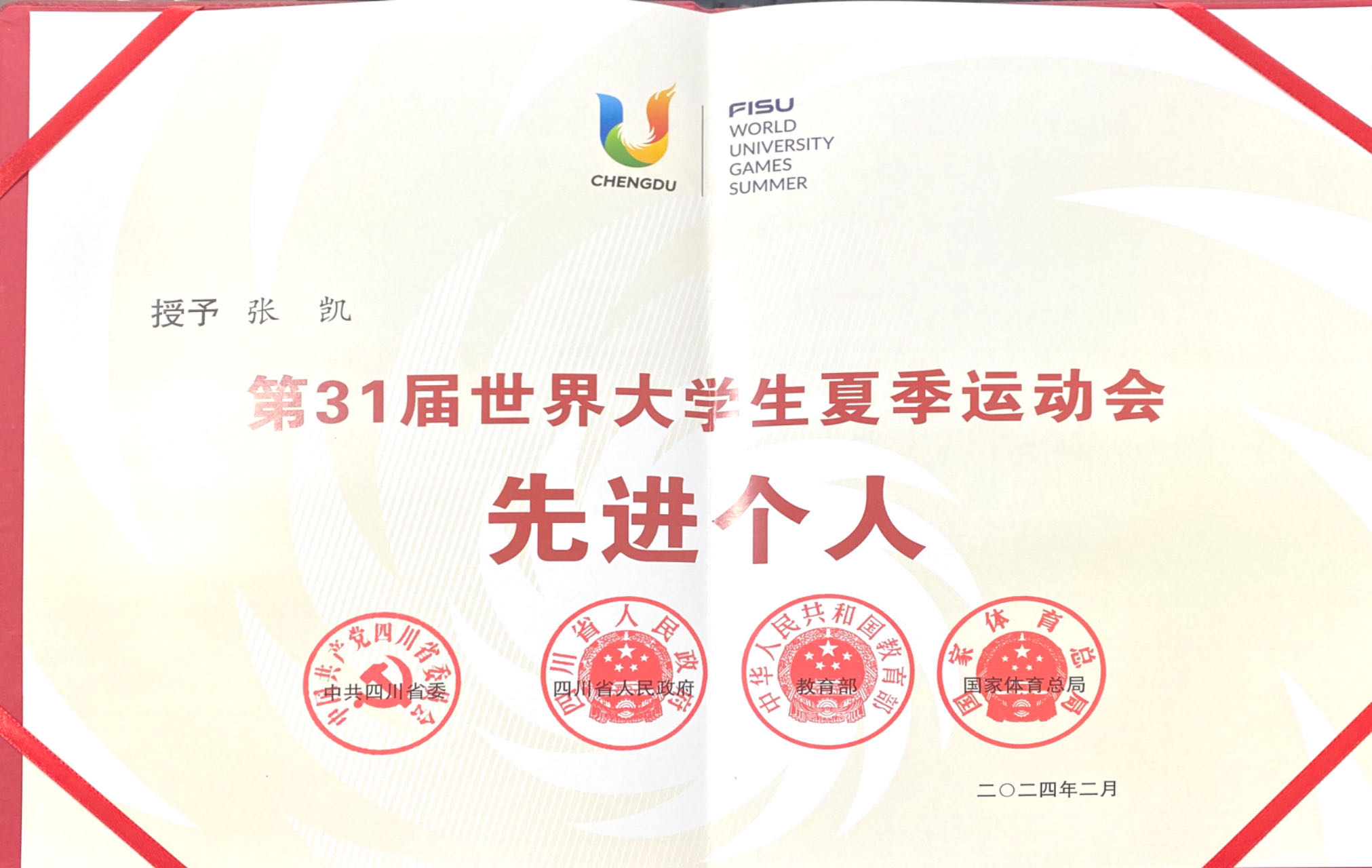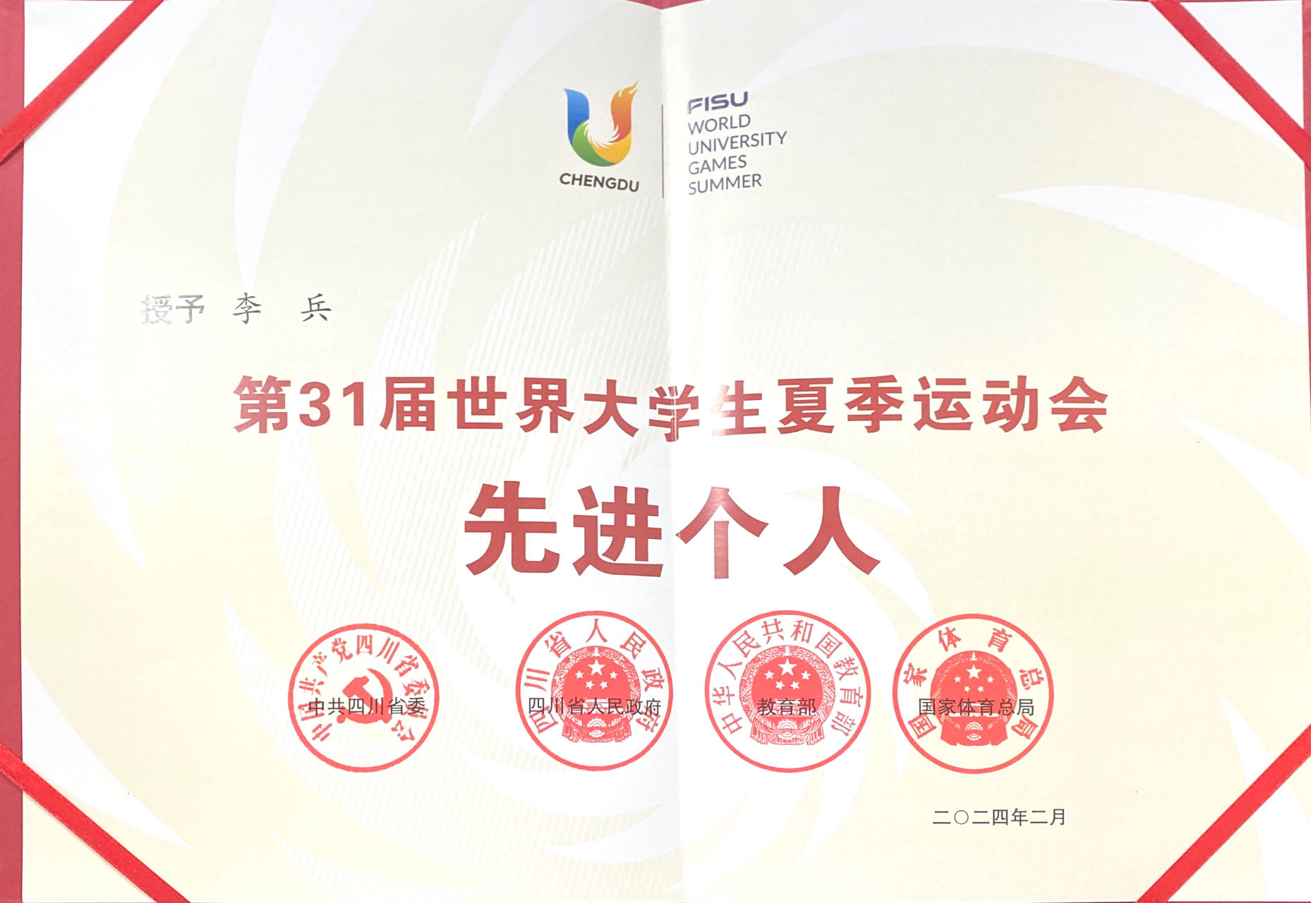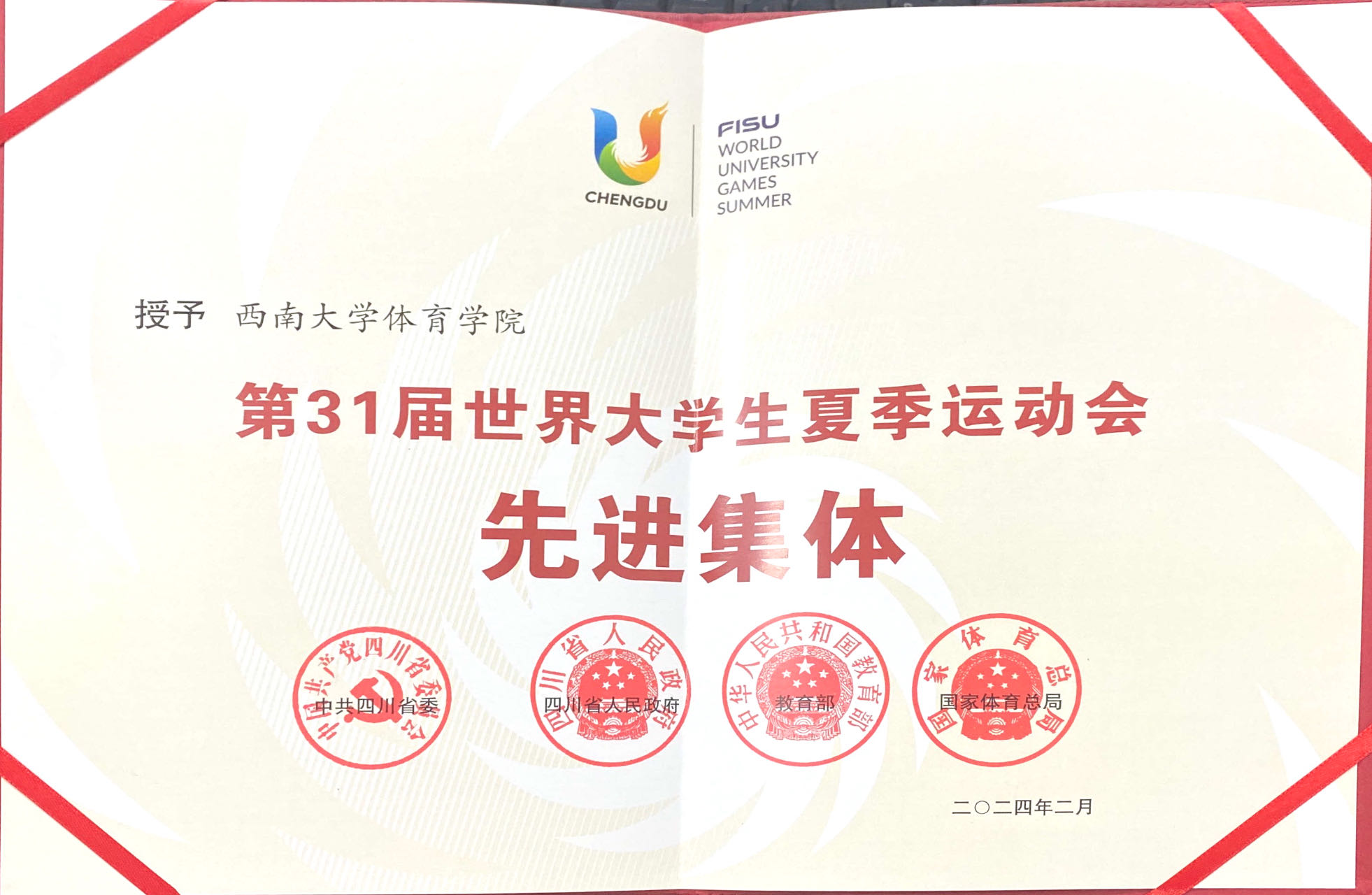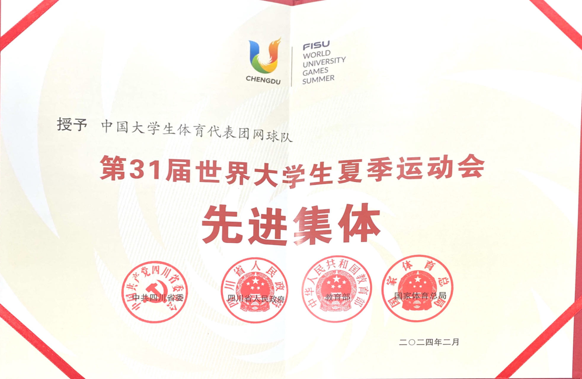 近日,中共四川省委、四川省人民政府、教育部、国家体育总局联合发布《关于表彰第31届世界大学生夏季运动会先进集体和先进个人的决定》,中国大学生体育代表团网球队、Beat365中文官方网站体育学院被授予“第31届世界大学生夏季运动会先进集体”称号,李兵、郭涵煜、张凯等3名师生被授予“第31届世界大学生夏季运动会先进个人”称号。