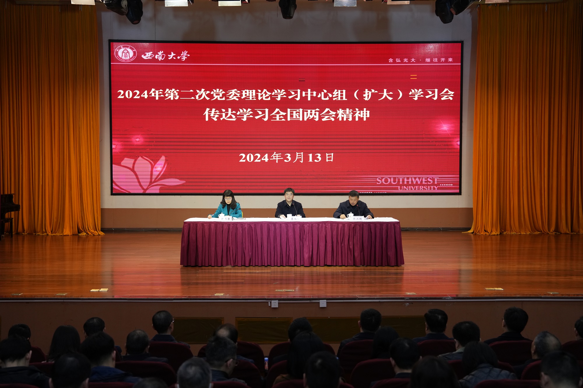 3月13日下午,学校召开2024年第二次党委理论学习中心组(扩大)学习会,深入学习贯彻习近平总书记重要讲话精神和全国两会精神,安排部署学校贯彻落实工作。校党委书记李旭锋主持会议并讲话。校领导、党委常委、党委委员、纪委委员、副处级以上领导干部以及各民主党派基层组织和统战团体负责人参加会议。