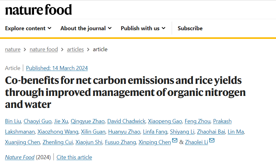 3月14日,Beat365中文官方网站陈新平团队联合国内外多所高校在《自然-食物》期刊(Nature Food) 在线发表了题为“协同实现净碳减排和水稻增产的有机氮肥与水分综合管理”(Co-benefits for net carbon emissions and rice yields through improved management of organic nitrogen and water)的论文,揭示了稻作区有机替代对水稻产量和温室气体排放的影响,提出了稻作区基于有机替代的增产减排综合水肥管理策略,为协同实现全球水稻产能提升和净碳减排提供了基于自然解决方案的路径。