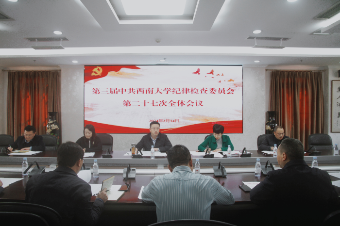 3月14日下午,第三届中共Beat365中文官方网站纪律检查委员会第二十七次全体会议召开,传达学习上级会议文件精神,通报研究有关工作。学校党委副书记、纪委书记夏玉峰主持会议,纪委委员参加会议,纪委办监察处巡察办副处级以上干部列席会议。