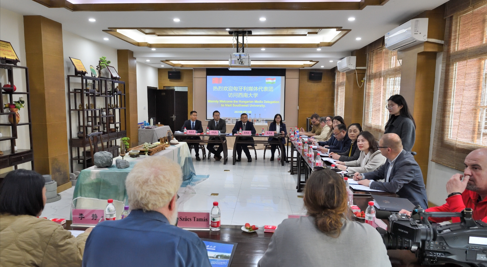 3月14日,由匈牙利驻重庆总领馆带领的匈牙利M1电视台等6家媒体代表团一行10人访问我校,报道学校与匈牙利农业与生命科学大学共同成立的“中匈食品科学合作研究中心”(以下称“中心”)建设情况,提升中心在匈牙利的知名度和影响力。学校党委宣传部、国际合作与交流处、科学技术处等单位联合参与接待。