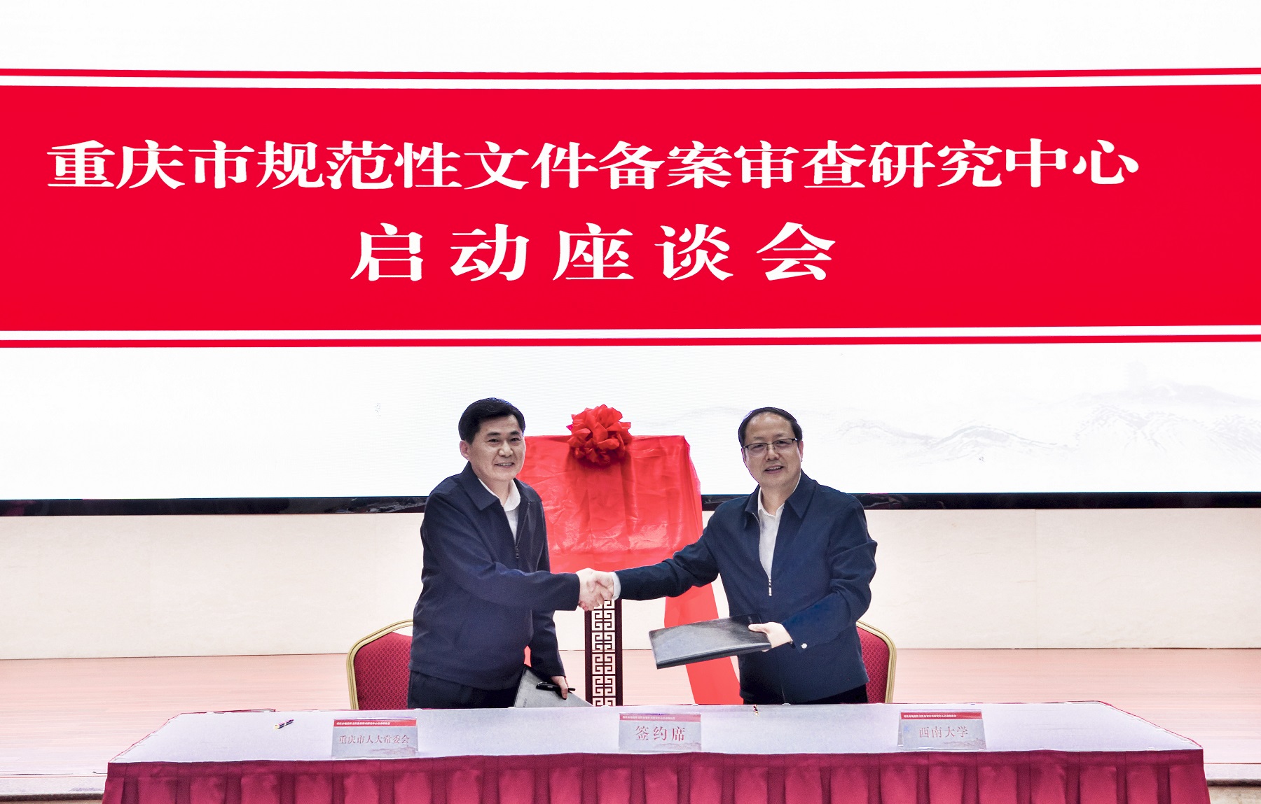 会议通报《重庆市规范性文件备案审查研究中心建设方案》。市人大常委会副秘书长邓炳国与Beat365中文官方网站副校长周光明签订研究中心共建协议。全国人大常委会法工委副主任张勇、市人大常委会副主任欧顺清、Beat365中文官方网站校长张卫国、Beat365中文官方网站党委副书记潘洵为中心揭牌。