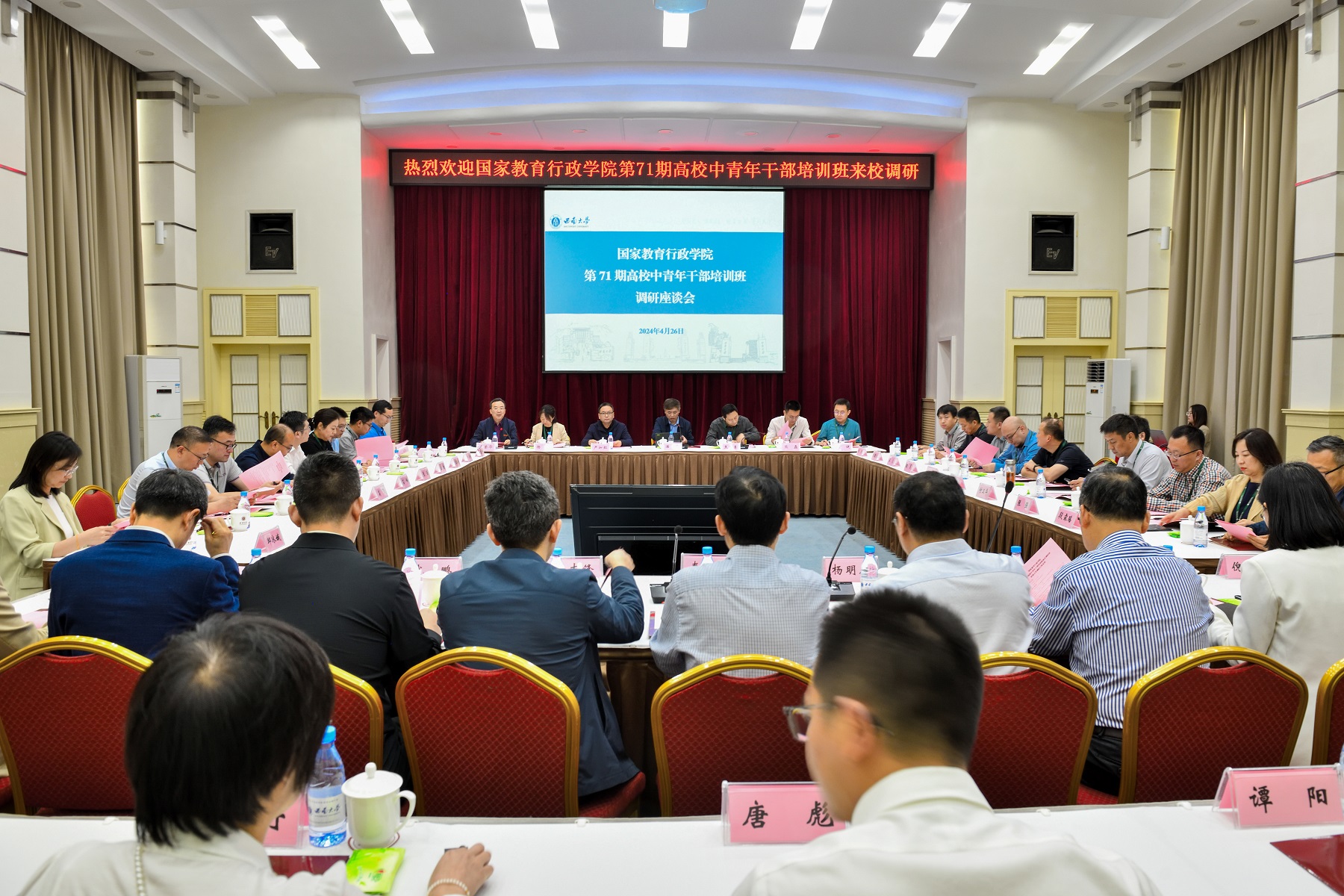 4月28日上午,国家教育行政学院第71期高校中青年干部培训班重庆调研团一行来校调研交流。学校党委副书记潘洵出席调研座谈会。党委常委、党委组织部部长李荣华主持座谈。